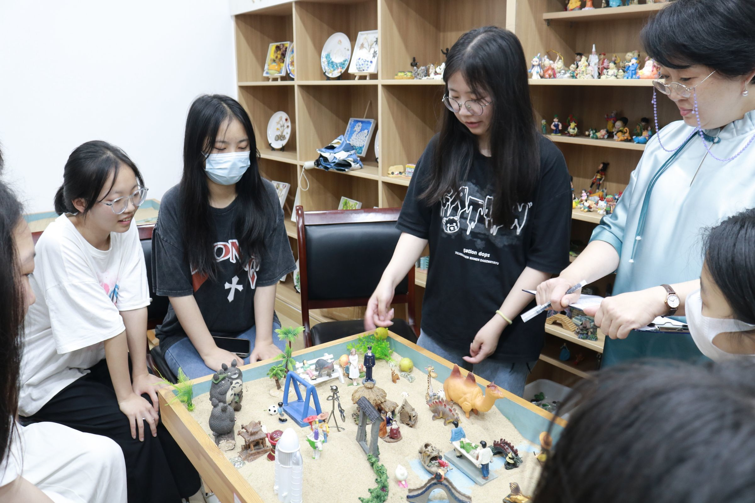 活动伊始,杨杰老师向同学们介绍了沙盘游戏的种类、基本规则和注意事项,并确定此次选择的种类为团体无主题沙盘,随后组织同学们通过抽签决定各自摆放沙盘玩具的顺序。同学们以沙盘为中心围成一个圈,在无任何交流的条件下依次摆放玩具。在经历了7轮的摆放和调整后,最终呈现出一个丰富多彩的沙盘。活动的最后,杨杰老师通过沙盘玩具逐一分析同学们的内心情感、性格以及处事方法等,并提出了相应的建议。
